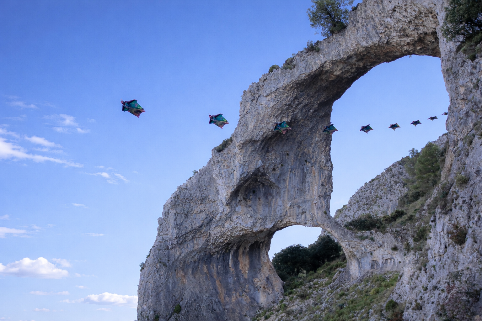 A clean wingsuit flight through a National rock arch - Alicante, Spain